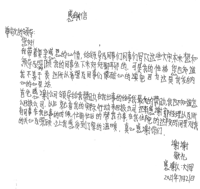经过半个月治疗休养,刘军手部已无大碍。出院后的他写了一封感谢信并为公司送了一面锦旗,他说道,是乐动网页版登录界面这个大家庭让他感受到了关怀和温暖,他表示要把这种关怀变成工作上的动力,争取早日返回工作岗位,努力工作,回报大家的关心和关爱。