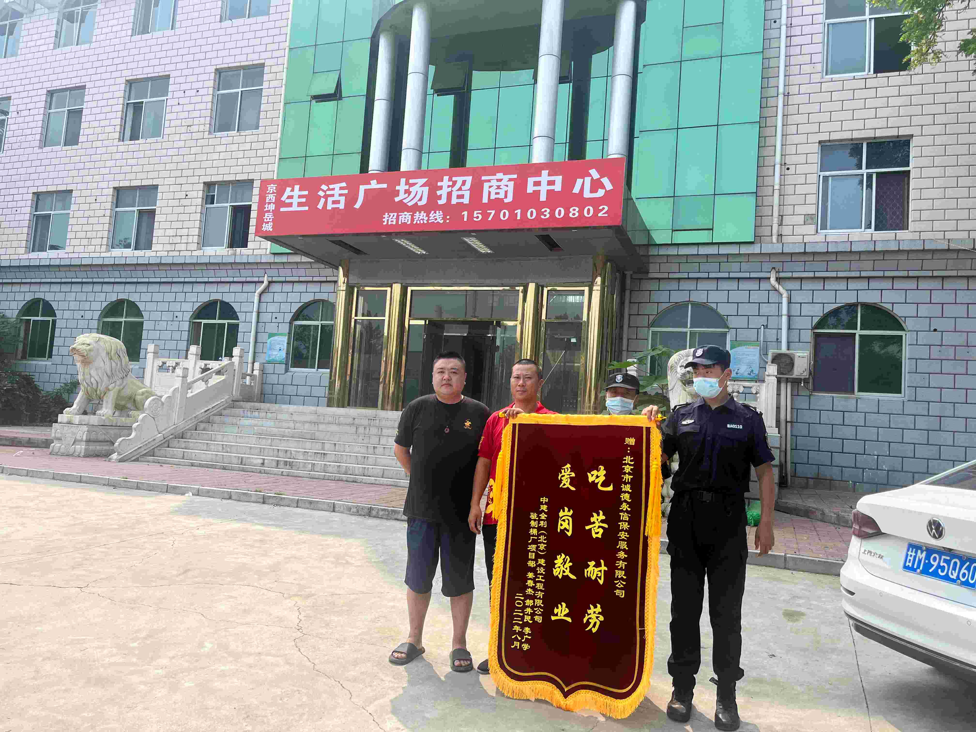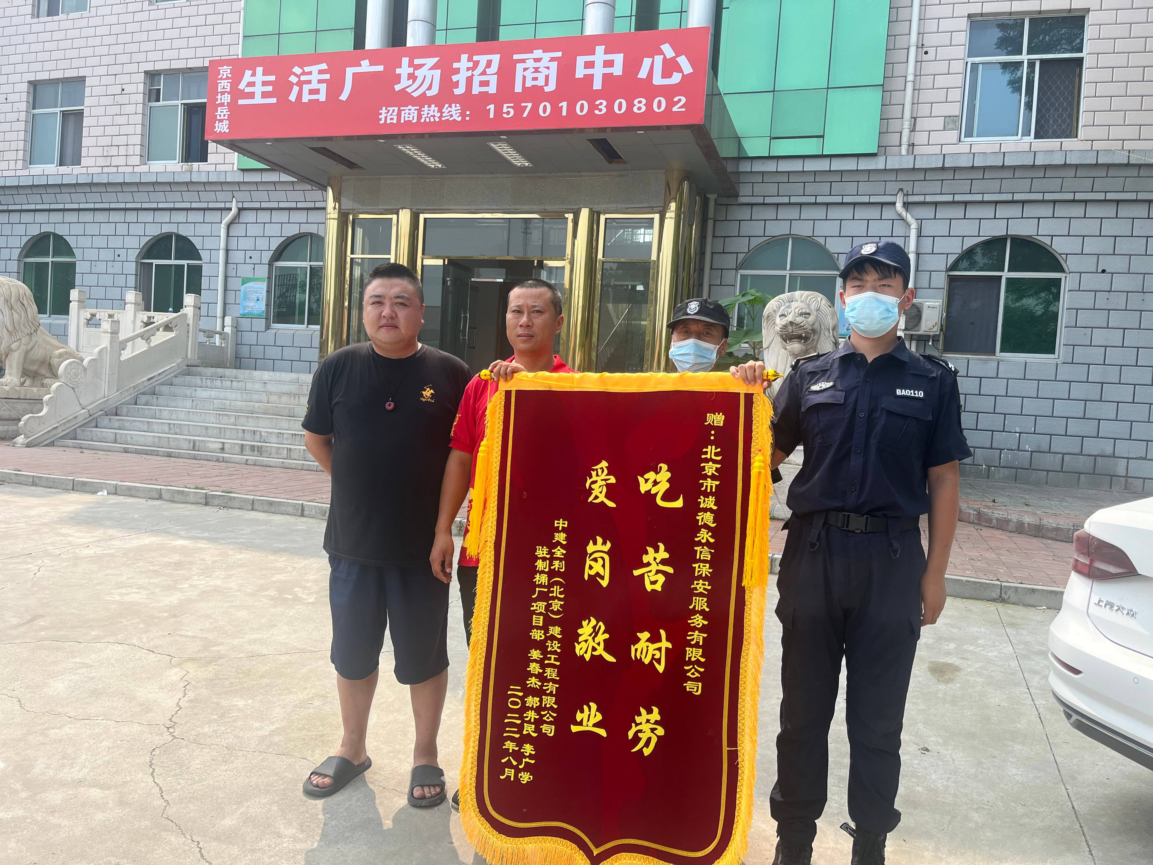 2022年8月1日,中建全利招商办公处驻制桶厂项目部由姜春杰等人为代表,将一面绣有“吃苦耐劳,爱岗敬业”的锦旗送到北京市乐动网页版登录界面保安服务有限公司项目负责人的手中,对我司保安队的优异工作表现表示诚挚的感谢。